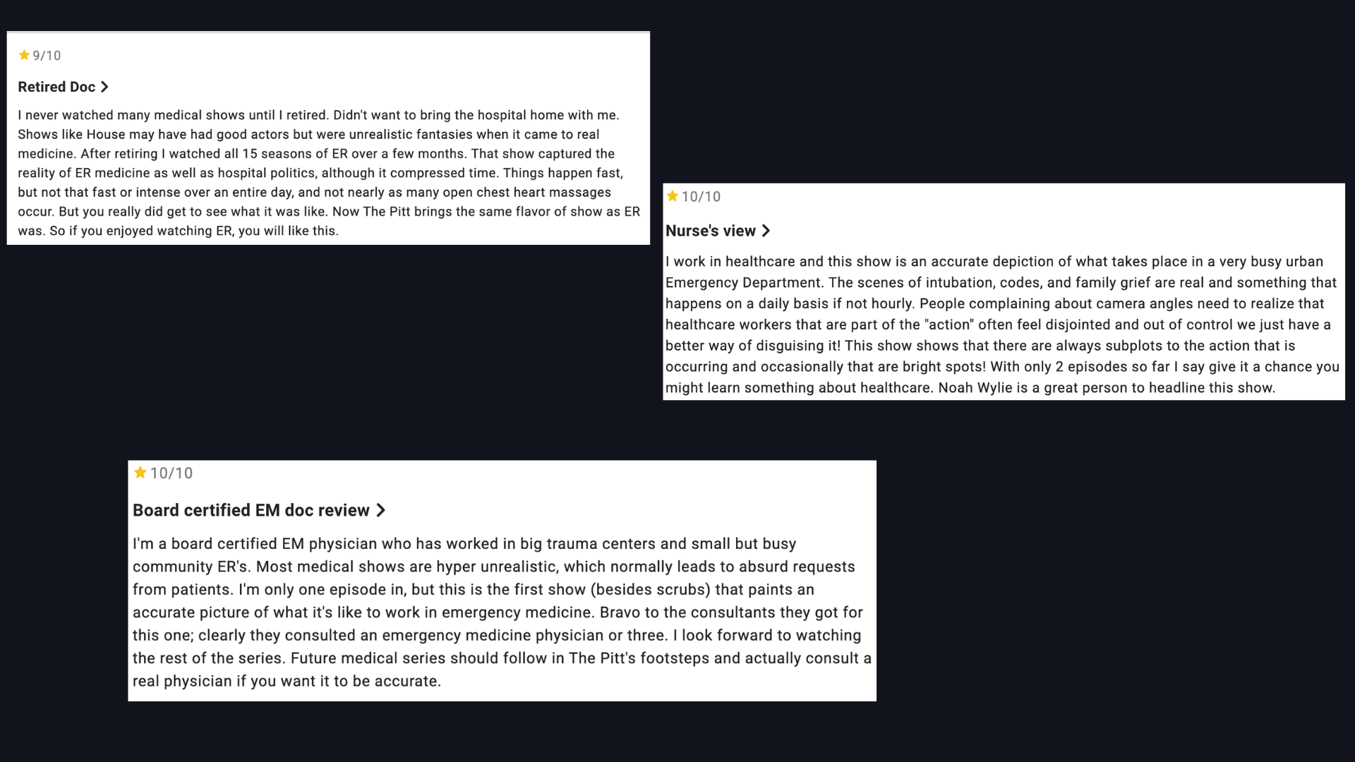 Taking a look at these reviews, we can see the positive experience past healthcare workers have had watching this show, and how realistic the show is. A lot of these reviews mention on how realistic this show is with working within an Emergency Department. An behind the scenes look of The Pitt mentions that they rehearse the procedures to make them look real. They even have past healthcare workers playing doctors or nurses in the show!